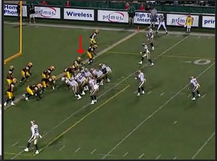 As the play begins, McIntyre lines up at the left defensive end spot in place of the injured Justin Hickman. With no time left on the clock, this will be the final play of regulation, barring any penalties. His job in this base defence will be to stay in his pass-rush lane and contain on his side.