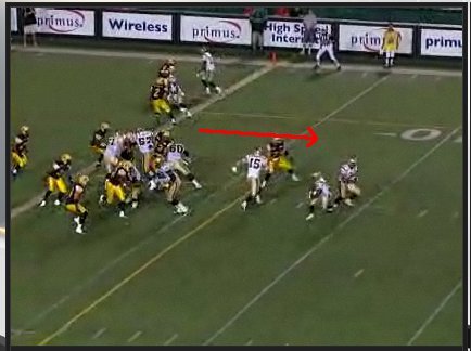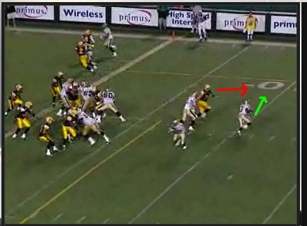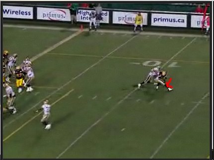 McIntyre gets up field in time to see Jyles fake to Fred Reid and turn to his left for a bootleg. The Winnipeg receiver comes across the field and attempts to set up a lead block for Jyles.