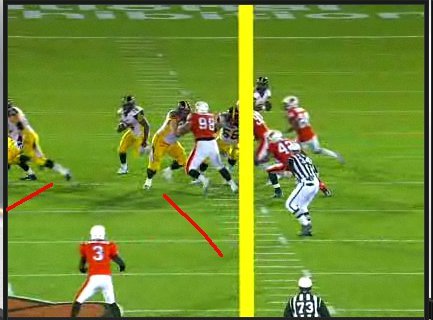 With the middle linebacker vacating the middle of the field on a blitz, Hamilton’s offensive line creates a hole for Cobb that you could drive a truck through.
