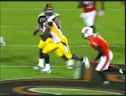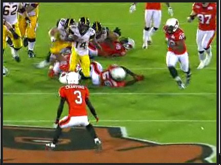 As Cobb accelerates through the hole, B.C. safety Tad Crawford is the only one left in front of him. However you can see that Crawford is waiting for him in the hole, not moving his feet. He’s also hesitant, waiting for Cobb to bring the contact to him instead of stepping up in the hole and delivering the blow.