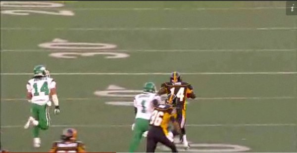 Cobb is eventually forced out of bounds by Sasktachewan’s James Patrick, but not before he gains 52 yards on his first run of the day, thanks to some stellar blocking by the big boys up front.