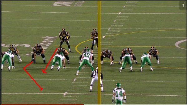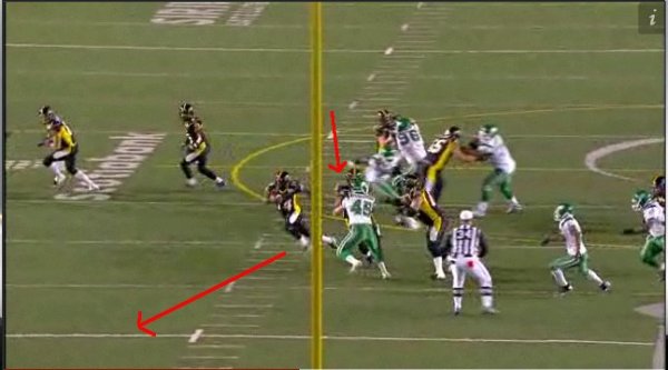 Ticats linemen Simeon Rottier and Marwan Hage get great blocks and along with Jason Jimenez, open a huge hole for Cobb to run through. You can see that Cobb is looking the same way as the arrow, to the right of Rottier. However, he cuts the run back inside and bursts through the hole between Hage and Rottier.