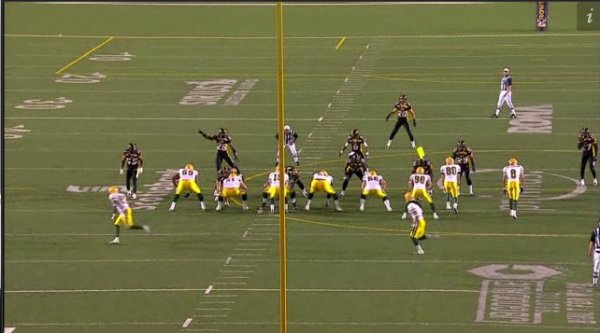 Barker uses his closing speed to track Zabransky down and records the first sack of his young career. This play seems to work almost everytime it’s called but is contingent on the blitzers getting to the QB quickly because it leaves the receivers in single coverage.