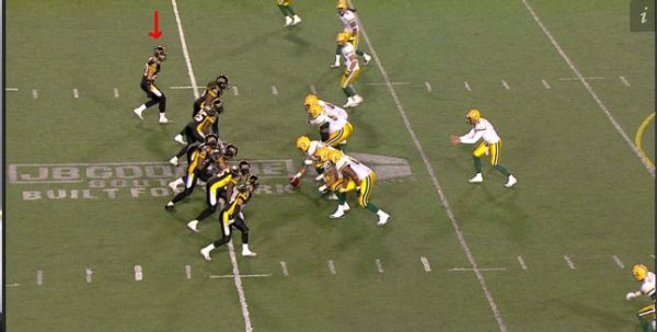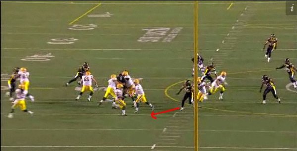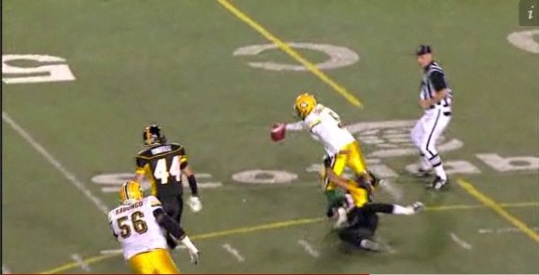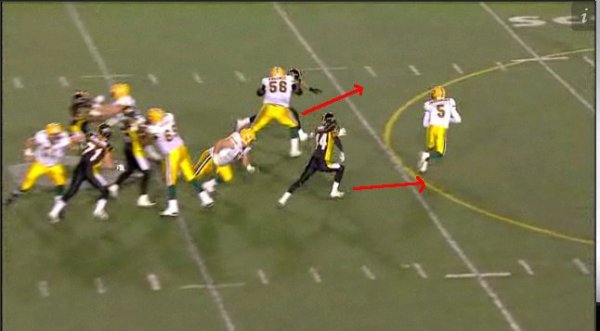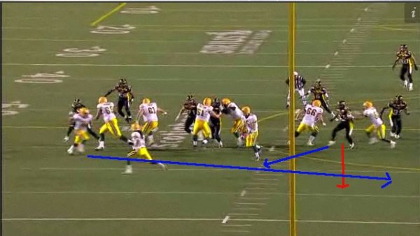 Instead of chasing the quarterback, Justin Hickman plays true to his gap responsibility and rushes up field before turning in to follow the ball. By doing this he cuts off the receiver and tackles him in the backfield for an 8-yard loss. When coaches tell players to “trust the guys around you,” this is what they mean. If Hickman tries to be a hero and abandons his gap to try and sack Ray on what looks like a rollout, the handoff takes Edmonton’s receiver right by him for a big play. By trusting that the players on the opposite side will do their job, Hickman does his and the result in a busted play and a big loss for the Edmonton offence.