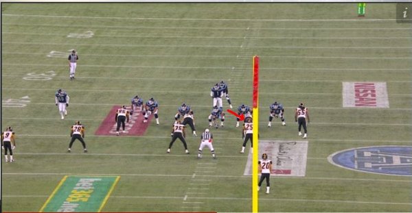 This look has McIntyre lined up as a defensive end, stacked outside shade or on the outside shoulder of the right tackle. McIntyre’s versatility within the defensive scheme gives Ticats defensive coordinator Greg Marshall a number of options on every series.