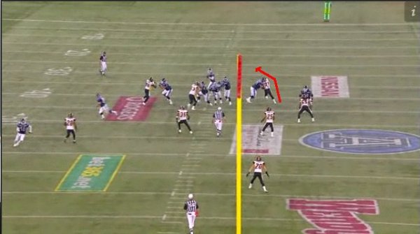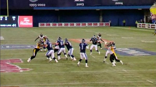 After setting him up, McIntyre executes a perfect rip move, which gets him around the big body of the right tackle and brings his momentum towards the quarterback. Even though McIntyre is on Cleo Lemon’s front side, the quarterback is looking down field and doesn’t see him coming. McIntyre strips Lemon of the ball and records his second sack of the night.