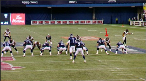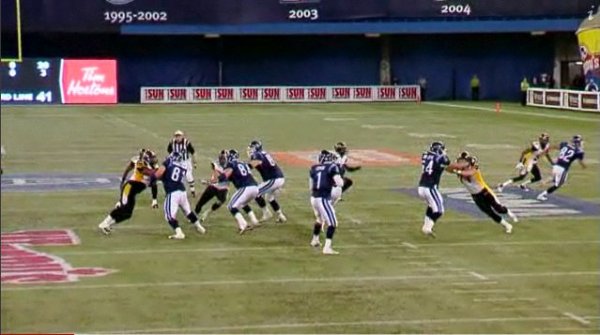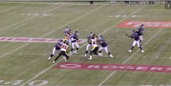 As the play begins, you can see that the Ticats are lined up with their typical second-down personnel. Which means that Ticats defensive linemen Stevie Baggs, Justin Hickman and Garrett McIntyre are all on the field at the same time, with McIntyre kicking inside to play defensive tackle. Some members of the media criticized the Ticats for signing Baggs, citing the talent that they already had at defensive end. As you can see, it’s possible and effective to have them all on the field at once.