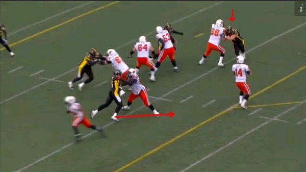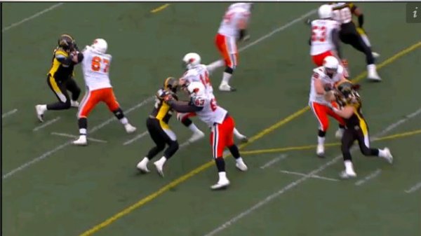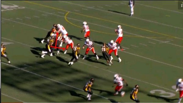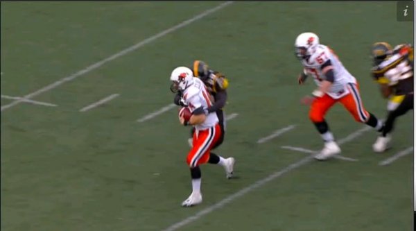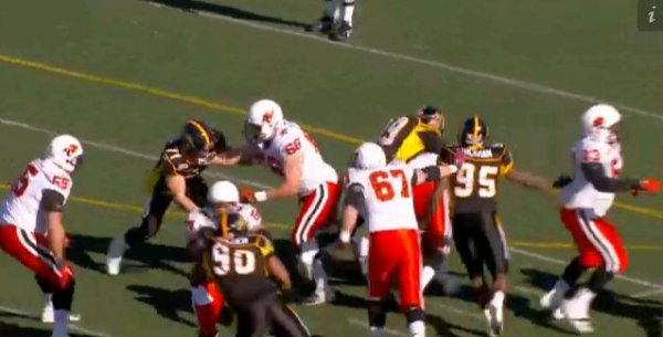The Ticats defence lines up in a blitz look here on first down, with Ticats LB Otis Floyd lining up along the line of scrimmage with the rest of the D-line. With Floyd joining the front four, it puts the Ticats in a rare 5-2 look.