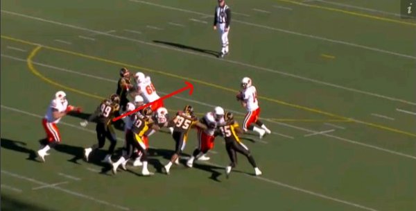 As he is prone to doing, once Lulay feels the pressure from the outside he tries to step up and scramble up the middle away from the rush. You can see that only Jermaine Reid stands between him and the open field. Reid gets perfect position on his man and allows himself to see where the play is going. By not committing to one side or the other of the offensive lineman, Reid is in position to make a play, no matter which side Lulay tries to run.